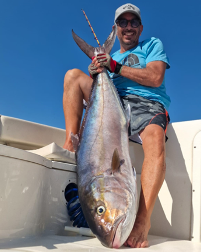 Parte lenta ma decisa, tiene il fondo, continua la sua corsa senza fermarsi. Guardo il mio socio e gli dico che è lei, la oversize. Il mio amico mi guarda e dice: “Ma sei sicuro?”. Io sorrido e gli rispondo “Sì, certo”. Conosco la mia attrezzatura: canna 12 libbre, mulinello sempre 12 libbre, dynema 0,23 in bobina, 0,52 di mediano, 0,62 di terminale e amo 6/0. Sono leggero per quel pesce ma mi piace essere sportivo. Lo seguiamo con la barca, lo pompo, gli prendo metri ma appena lo stacco dal fondo riparte come un treno. Decido di chiudere la frizione e pomparlo verso l’alto. La canna me lo permette, avendo una curva ampia e progressiva.