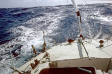 Ricordo altri due episodi drammatici. Nell’autunno del 1976 avevo da poco faticosamente superato lo stretto di Gibilterra, a causa di una corrente contraria che può raggiungere anche i 5 nodi. Non avendo motore solo al terzo tentativo riesco a raggiungere l’Atlantico. Come mia consuetudine festeggio le difficoltà superate stappando una bottiglia di prosecco per un brindisi solitario. Il giorno successivo, dopo un pranzo a base di tonno appena pescato, il tempo cambia. Il vento rinforza e arriva il mal di mare. Rendo al mare quanto al mare avevo preso. Non avendo anemometro non posso dire con certezza a quanto soffiasse sicuramente a più di 40 nodi. Mi metto alla cappa secca, blocco la barra del timone e mi chiudo in cabina abbracciato al bugliolo. Passato il maltempo riprendo a veleggiare in un mare attraversato da onde che non avevo mai visto prima, impressionanti e magnifiche.