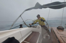 Chiama in coperta i ragazzi con cinture e cerate, accende il motore, l’aria è incredibilmente ferma, si sente solo il borbottio del Volvo Penta… A prua un ospite ha il comando del salpancora in mano, inizia a salpare, ma come arrivano le prime raffiche a 30-35 nodi la barca si traversa e solo aumentando di giri riporta la prua al vento per poter recuperare l’ancora.