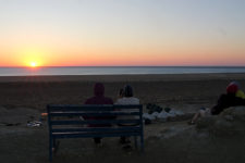 Turisti osservano l’alba dall’accampamento sulla sponda del lago d’Aral, 23 settembre 2025 (Valerio Clari/il Post)