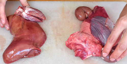 • Dividete cuore e polmoni, da quelle tenere, appunto reni, fegato e milza