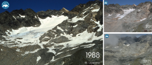 Il confronto fotografico: negli ultimi 37 anni il ghiacciaio non è “quasi più visibile a causa dell’ingente perdita di spessore”