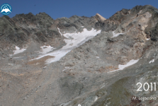 Tre fotografie, scattate nel mese di agosto in tre anni differenti, ritraggono il ghiacciaio di Suretta Sud, documentando il suo evidente ritiro.