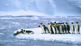 Un gruppo di pinguini cammina sul ghiacciaio Thwaites, in Antartide occidentale