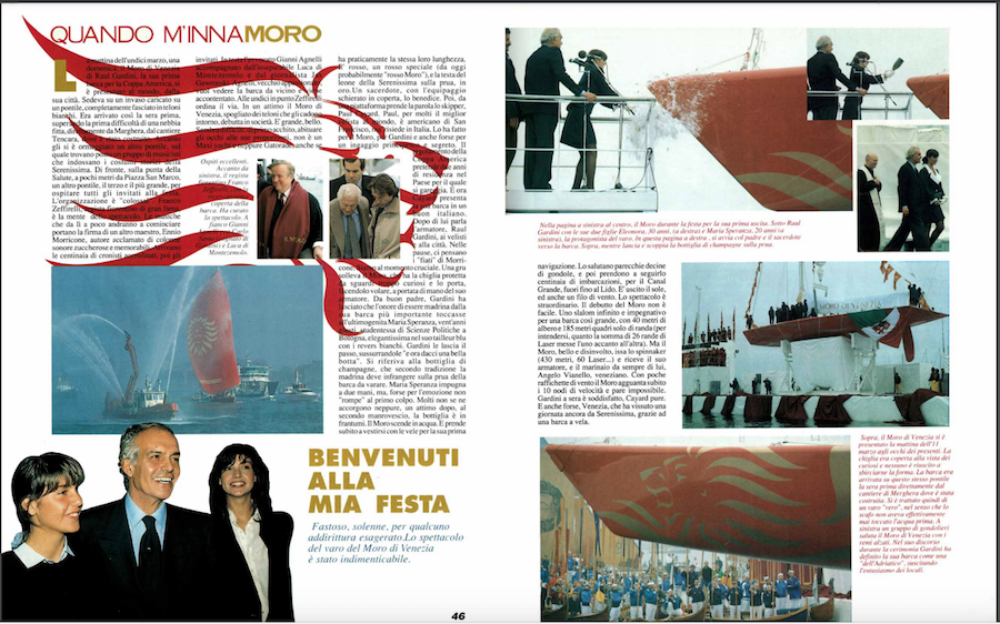 Dopo di lui parla l’armatore, Raul Gardini, ai velisti e alla città. Nelle pause, ci pensano i “fiati” di Morricone. Siamo al momento cruciale. Una gru solleva Il Moro, che ha la chiglia protetta da sguardi troppo curiosi e lo porta, facendolo volare, a portata di mano del suo armatore. Da buon padre, Gardini ha lasciato che l’onore di essere madrina dalla sua barca più importante toccasse all’ultimogenita Maria Speranza, vent’anni giusti, studentessa di Scienze Politiche a Bologna, elegantissima nel suo tailleur blu con i revers bianchi.
