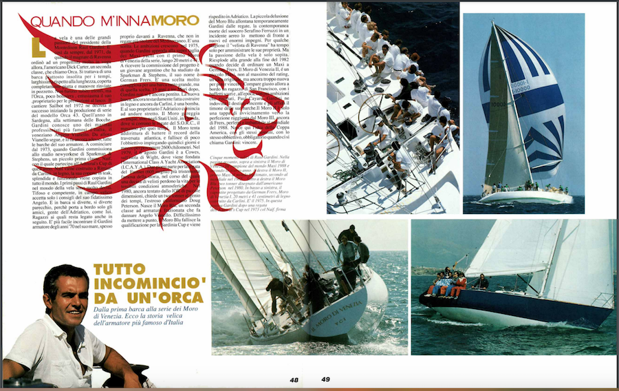 E’ più facile incontrare il Gardini armatore degli anni ‘70 nel suo mare, spesso proprio davanti a Ravenna, che non in regate più titolate del Mediterraneo. E’ una scelta. Le ambizioni crescono nel 1975, quando Gardini approda alla super taglia dei Maxi yacht con il primo Moro di Venezia della serie, lungo 20 metri e 41. A ricevere la commissione del progetto è un giovane argentino che ha studiato da Sparkman & Stephens, il suo nome è German Frers. E’ una scelta molto coraggiosa per una barca tanto grande, ma di quella scelta, 15 anni e tre Mori dopo, Gardini non si è ancora pentito.