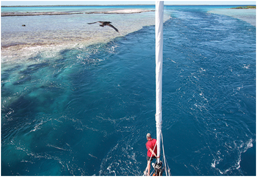 A Mopelia esiste anche un falso passaggio molto simile a quello vero, tranne per il fatto che si interrompe formando un ‘cul de sac’ da cui poi è impossibile uscire. Stando alla carta è quello che abbiamo imboccato noi. Guardo Michele ed è sicuro e tranquillo come sempre, e ovviamente mi grida di fare attenzione al compito che mi ha affidato. Mannaggia a me.