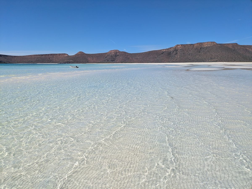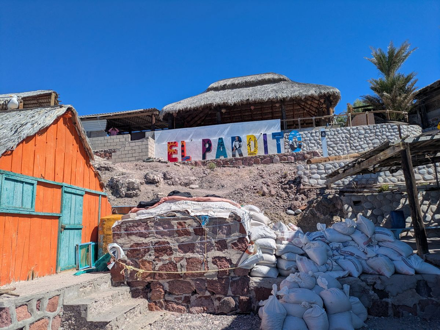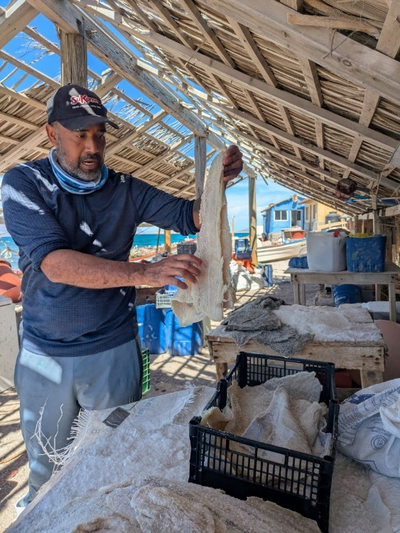 I pescatori ci hanno aiutato a portare il tender in spiaggia e poi ci hanno fatto una visita guidata di tutta l’isola (50 metri di camminata in tutto…). Alla fine ci hanno spiegato che la maggioranza del pesce pescato lo mettono sotto sale per rivenderlo a La Paz. Non potevamo andarcene a mani vuote – abbiamo preso un bel rombo e sette code di aragoste. In fondo, se non ci si vizia che vacanza è?!?