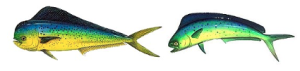 A sinistra lampuga maschio, col profilo del capo verticale, a destra un esemplare femmina