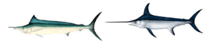 In rarissimi casi potrebbe capitare proprio il fantomatico pesce spada, Xiphias gladius, col fondato rischio di vedersi la lenza tagliata in un attimo dal bordo tagliente del suo gladio… Rispetto all’aguglia imperiale, presenta rostro molto allungato e dal profilo appiattito, con le pinne dorsale, anale e pettorali estremamente rigide e falcate. Tipica è anche la carenatura laterale del peduncolo caudale, molto sviluppata. Taglia media sotto i 100 kg, massima che supera assai raramente i 2-3 quintali in mediterraneo, misura minima di legge 140 cm.