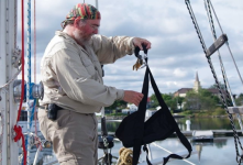 La drizza utilizzata deve essere in perfette condizioni, senza segni di usura, e deve passare su un bozzello adeguato e ben fissato in testa d’albero. L’imbracatura o la sedia devono essere certificate e indossate correttamente, con un punto di attacco chiaro e ridondante.
