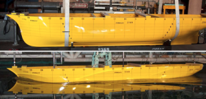 Sopra: modello del Vespucci in scala 1:14 realizzato per le prove nella vasca navale dell’INSEAN (CNR) di Roma; sotto: onda e scia del modello senza inclinazione a velocità di rimorchio di 10 nodi in acqua calma.